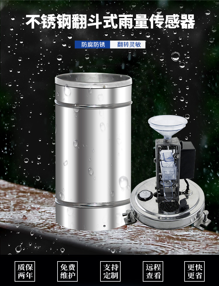 翻斗式雨量傳感器是一種水文、氣象儀器,用以測量自然界降雨量,同時將降雨量轉換為以開關量形式表示的數字信息量輸出,以滿足信息傳輸、處理、記錄和顯示等需要。可用于氣象臺(站)、水文站、農林、國防、野外測報站等有關部門,配合雨量記錄儀來測量降水量、降水強度、降水時間等。可為防洪、供水調度、電站水庫水情管理提供原始數據。